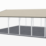 This 22x31 Vertical Style RV Carport has a 29 GA horizontal style sheet panel down each side with J-trim. It’s fully customizable, allowing you to add more panels on the sides or enclose a side completely by adding gables and panels. We can also build a fully enclosed RV garage perfectly sized for your recreational vehicles. This protects your RV from theft and elemental hazards like rain, wind, and UV rays. With our 22x31 RV Carport at your side, you can rest assured your things are secure at all times.